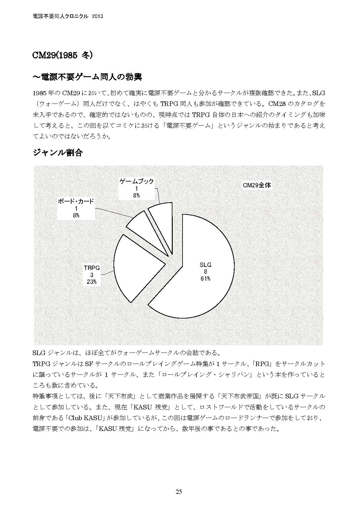 コミックマーケットにおけるジャンル「ゲーム(電源不要)」について、コミケカタログからその配置や申込傾向などを調査・分析し、それによって動向を追う本です。新しいものだけでなく、可能な限り昔のデータも調査する事によって、コミケにおけるジャンル「ゲーム(電源不要)」の歴史をも俯瞰し、つかむ事ができるような本にしたいと考えています。